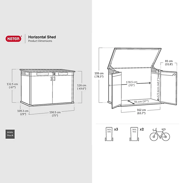 - 2020l capacity, the unit can store two 360l or three 240l wheelie bins. Features front opening and hydraulic pistons on the top lid for easy access